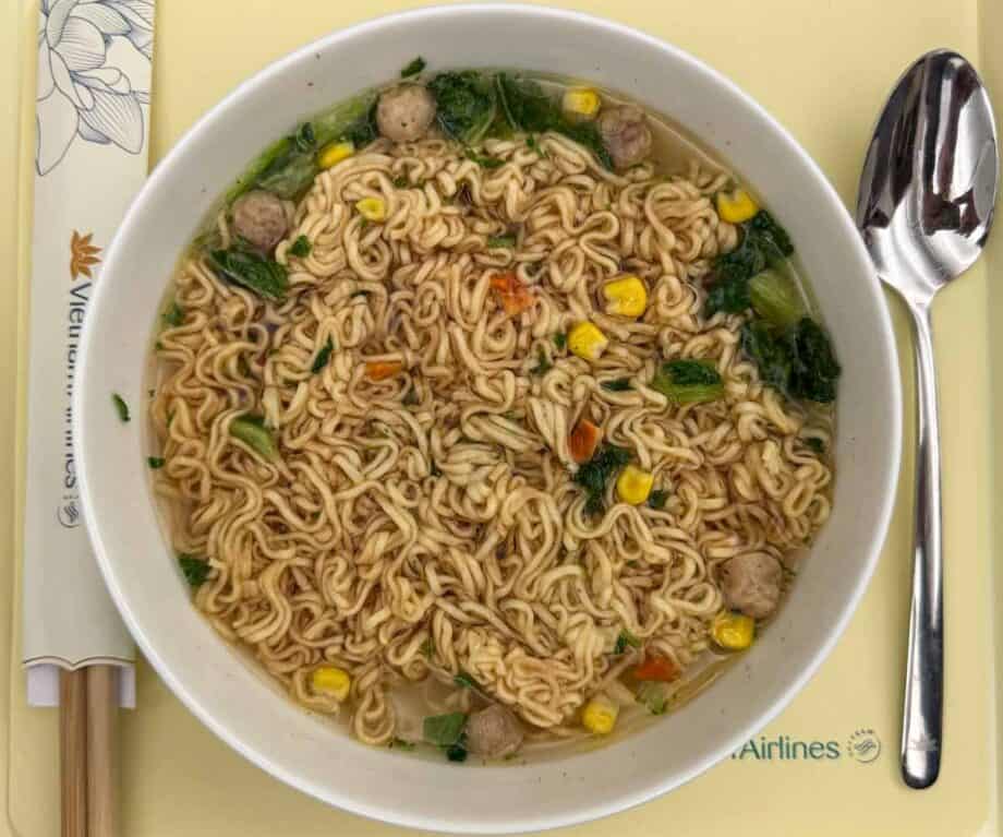 Next was an unappetising appetiser which we sent back. It comprised a stuffed pepper with beans and vegetables that were so cold they were almost frozen and were served with no sauce, which meant no flavour. Our main course was also sent back, a mixture of beans that were dry and flavourless with accompanying vegetables that were overcooked. This was possibly the worst vegan meal in business class that we have ever been served and was very disappointing indeed. The crew were very apologetic as they could see that everything we were served was uninspiring and not of a comparable standard to what other passengers were eating. They managed to find some instant noodles that were vegan and prepared these for us which were very tasty, but we didn’t book and pay for business class flights to eat instant noodles.