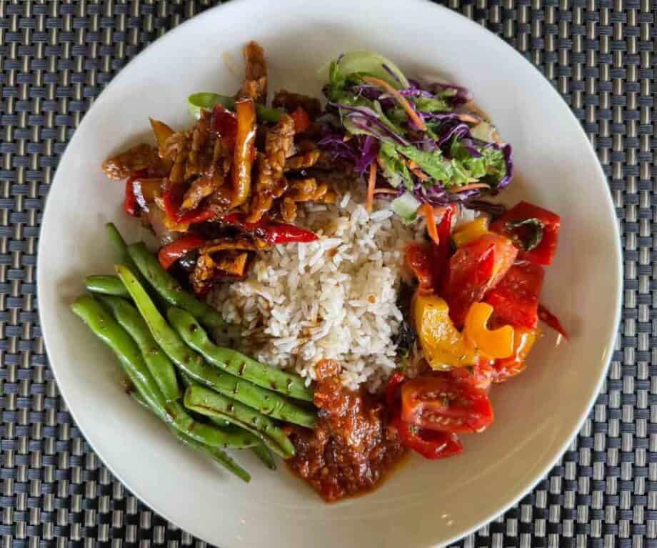 All meals and soft drinks were included in our stay, and as vegan travellers, we were thrilled to find a thoughtful range of plant-based options. Travelling to remote islands with limited dining choices can often be a concern, but Sorido Bay delivered in abundance. Plant-based proteins like tempeh and tofu featured prominently, alongside flavour-packed vegetable dishes and homemade condiments such as a spicy sambal made from chillies, garlic, tomatoes, and shallots. Standouts included the sticky soy-glazed tempeh and the rich jackfruit in coconut milk, while vegan pancakes with fruit, nuts, and cinnamon ensured a delicious start to the day.