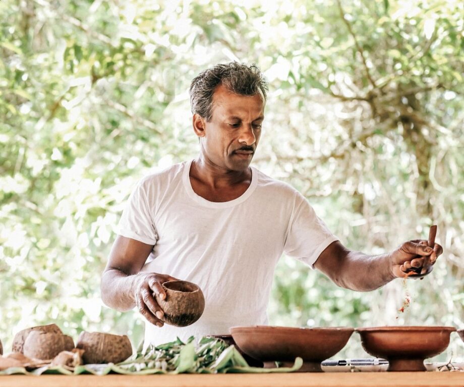 The local Veddha Chief leads a walk through the forest explaining how his hunter-gatherer tribe thrived for millennia with their intimate knowledge of available food and plants’ medicinal properties. Their animist beliefs and respect for the natural world forbid them from even picking a single leaf unless they have a use for it.
