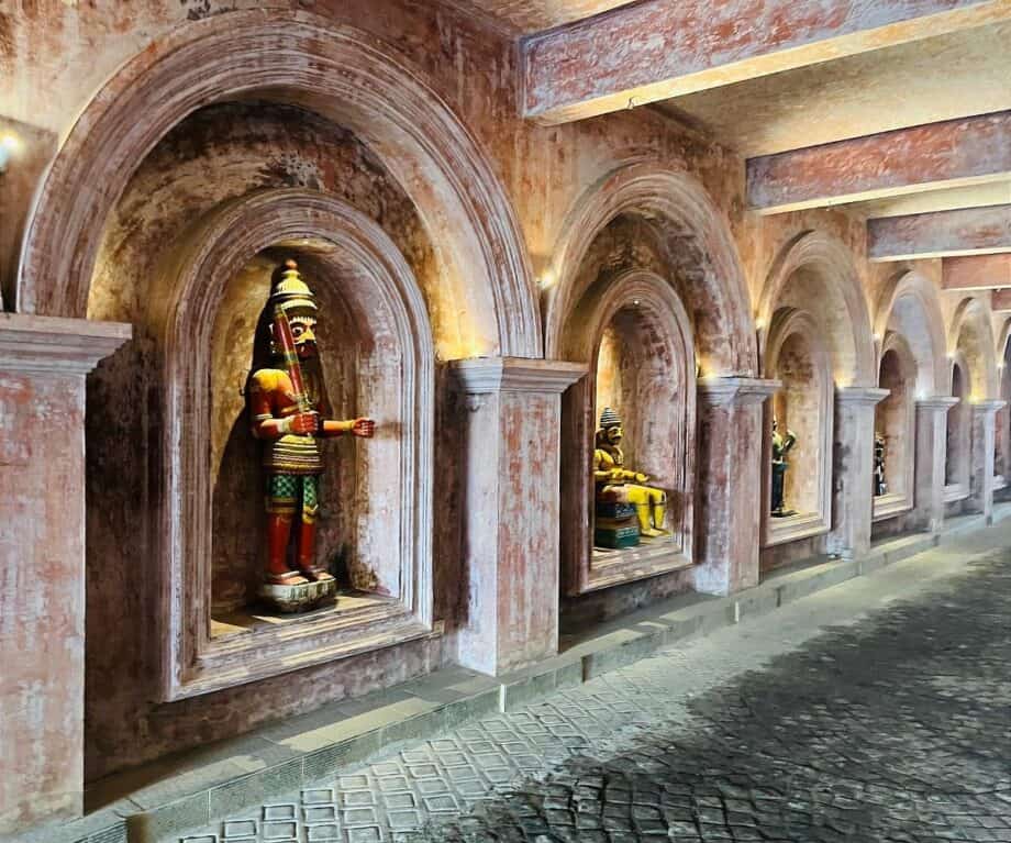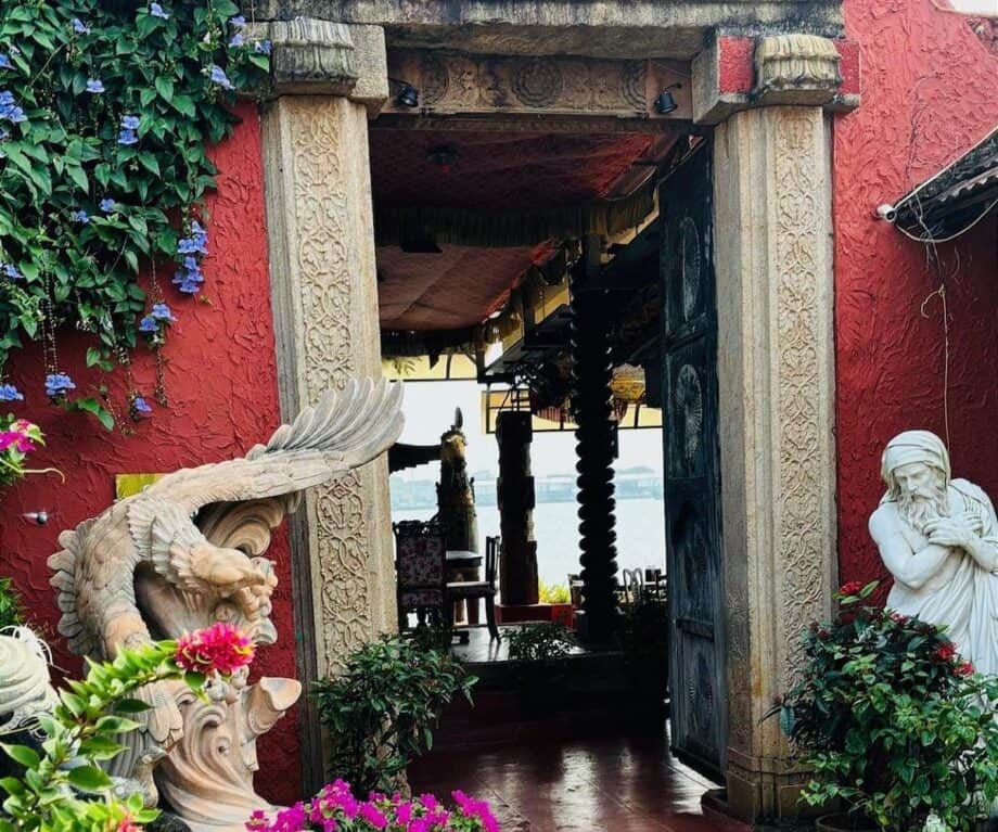 The decor with hanging Indo art-work and dancer statue on a plinth, has hints of a temple and the balcony looks out onto a row of Hindu festival horses.