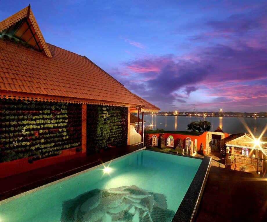 At Mattancherry’s heart, the restaurant has an all day menu open to residents and non-residents. Guests enjoy chilli fish, curries, local breads and international menu options as purple-flowering water hyacinth drift by, carried on the lake by the tide.