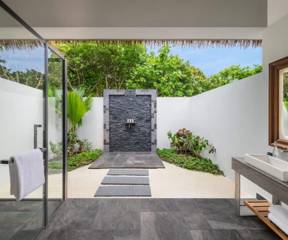 The bathrooms are outside (it’s a tropical island after all) but semi covered so you’ll always stay dry in case of rain but at the same time you can indulge in the joys of an outdoor shower in the sunshine or moonlight….or both. Hair dryers, robes, slippers, great smelling gels and creams, it’s all here.