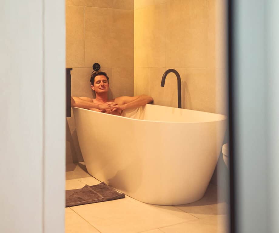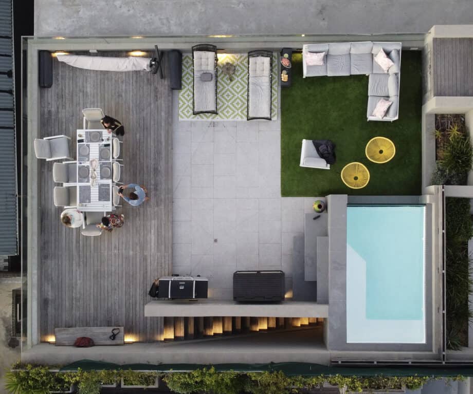 The open plan lounge, kitchen and dining area was beautifully styled and fitted out – so much so that it really did feel like we were staying in a home and not a rented apartment. Cooking was a dream in the fully-kitted kitchen, equipped with Nespresso machine, washer/dryer combo, and dishwasher. From here a walk down the passage leads to a glass door and a staircase leading to the apartment’s hero feature!