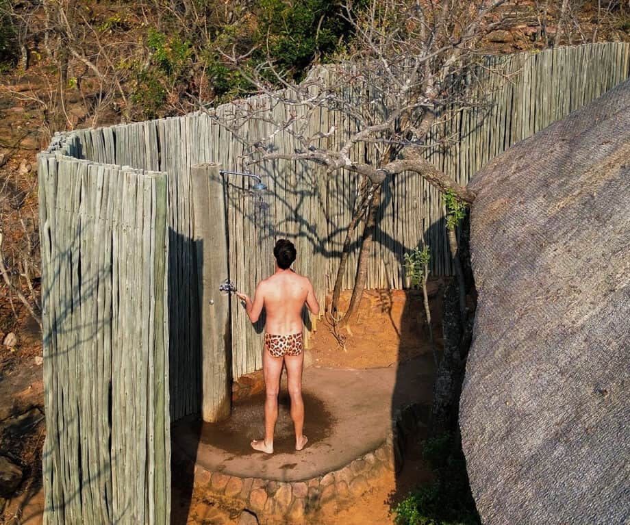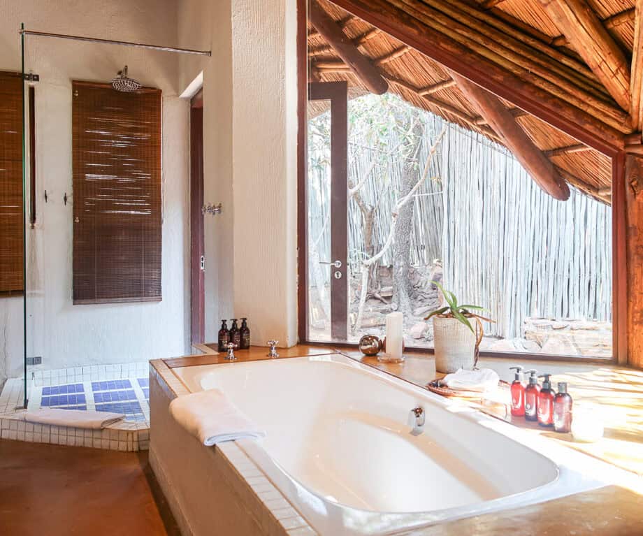 The bedroom leads to the back of the suite, where the spacious bathroom is located. Double vanity mirrors and sinks are complemented by a shower and bathtub. South Africa’s beloved Healing Earth amenities are used throughout – including one of my favourites, the Lemon Verbena and Argan Oil foam bath. Stepping through the shower door, one can enjoy a wash in the wild, as a private courtyard houses an outdoor shower. With hot water and privacy, it’s a wonderful way to cleanse after a game drive, especially in the evenings, when tilting your head back reveals a thousand sparkling stars.