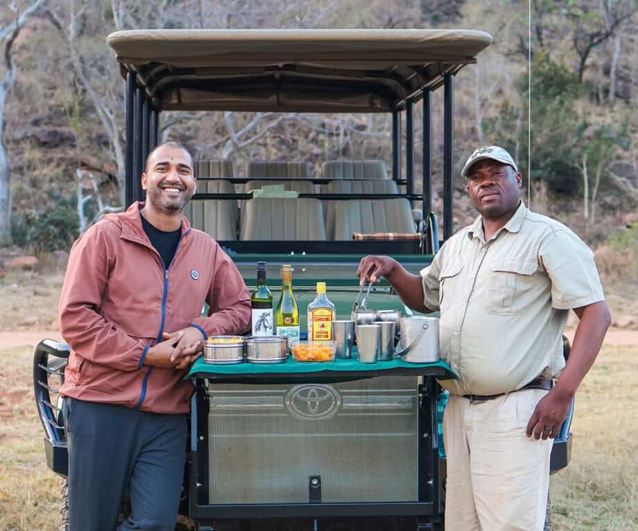After the surprisingly quick journey from Johannesburg’s OR Tambo International airport, we turned off the tar road into the entrance of Welgevonden Game Reserve. Stepping out the car, Steven walked over and introduced himself as our guide. While we waited for the other two guests to arrive, we eagerly indulged in the welcome snacks and drinks that have been laid out. From the gate, it was a further 30-minute drive to the Lodge, with a host of animal sightings en route – a small teaser of what awaited in the coming days, as well as a gentle way to begin disconnecting from the outside world. When we finally pass through Tswhene’s entrance, a welcoming party comprising the butler, chef, and lodge manager enthusiastically waved us in, offering warm towels and refreshing drinks.