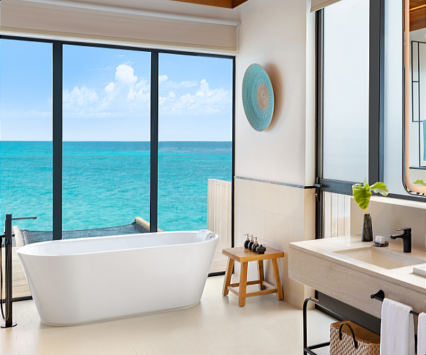 We stayed in a one-bedroom overwater suite and with 180 square meters of space it surely felt more like a villa instead of just a suite. While the terrace, pool and hammocks are certainly inviting at any given moment of the day, the interior of the villa deserves some of your attention too, especially the massive open plan bathroom that makes the room feel even more spacious.