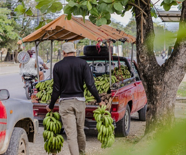 In this lush countryside, food is always at hand for the locals. Plantains freely picked from the trees, then boiled and mashed, make for a thrifty and nutritious breakfast. There is a Robinson Crusoe feel to their daily diet, especially as goat stew is a favourite.