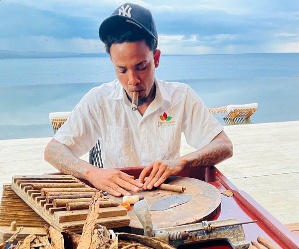 Alongside, guests try their hand at taking a tobacco leaf and rolling their own cigar. Their tutor warns that if a cigar is rolled too tightly it can not be smoked. Most guests take longer to roll their cigar than the 40 seconds it takes the maestro. Working with a partner, he can produce 800 cigars in a day.