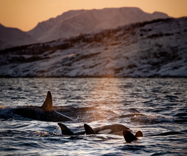 • As the low winter sun colours the sky pink, a perfect backdrop is created to the snow striated mountains that rise up from the fjords in Northern Norway. Below the surface of the inky black water, a feeding frenzy takes place during the winter months as orcas gather and greedily feast on migrating herring.