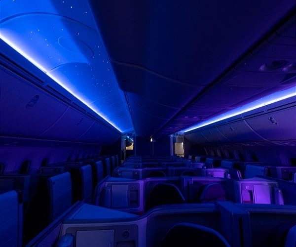 The 787 offers enhanced cabin air filtration, and its carbon-fiber composite airframe permits travel at a lower cabin altitude, resulting in a more comfortable flight. Guests will also notice a quiet cabin thanks to acoustic-treated engine inlets, as well as extra-large, dimmable windows, spacious overhead bins and lavatory toilets and faucets with touchless activation.