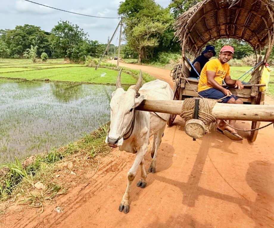 The small rural village of Hiriwadunna is located on the banks of the Hiriwadunna Lake near the town of Habarana in the North Central Province of Sri Lanka. After leaving my comfortable air-conditioned coach I walked down a track to a small clearing where my next mode of transport was waiting, a wooden bullock cart. I clambered aboard and we were soon bumping and swaying along a rough muddy track. The startling green of paddy fields lay on one side of me while the other side was forested.