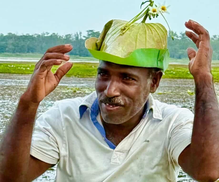 It was not long before we stopped and encouraged to dismount and follow our guides down a narrow path skirting the lake. It was a bit tricky conquering the quivering wooden jetty and creating the right balance of bodies in the catamaran-style canoes waiting to take us on a boat trip. However, we were soon gliding across the still waters sprinkled with water lily blossoms. I was soon to discover some amazing accessories that can be created from a lotus flower including a necklace and a hat.