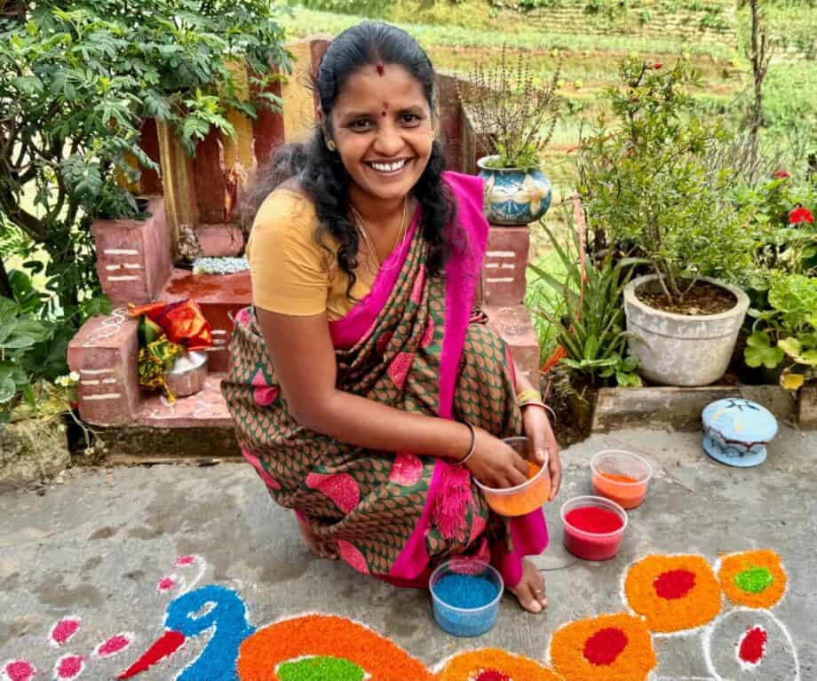 When I arrived in the village, I met one of its leading residents, Suresh, whose house I would be visiting after a short tour of the village. Tamils form the majority of a total population of one thousand but there are also people from Southern India. The old traditions are treasured here including the creation of the mandala. After the traditional Hindu greeting from Priya, wife of Suresh, I was shown how to create a mandala using rice powder to draw the outline (kolam) and coloured rice to ‘paint’ it. The mandala is symbolic in Hindu and Buddhist cultures and usually features a geometric design but, on this occasion, I was invited to assist in the creation of a multi-hued peacock.