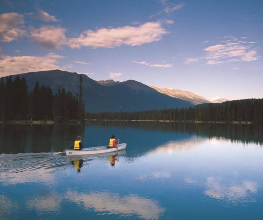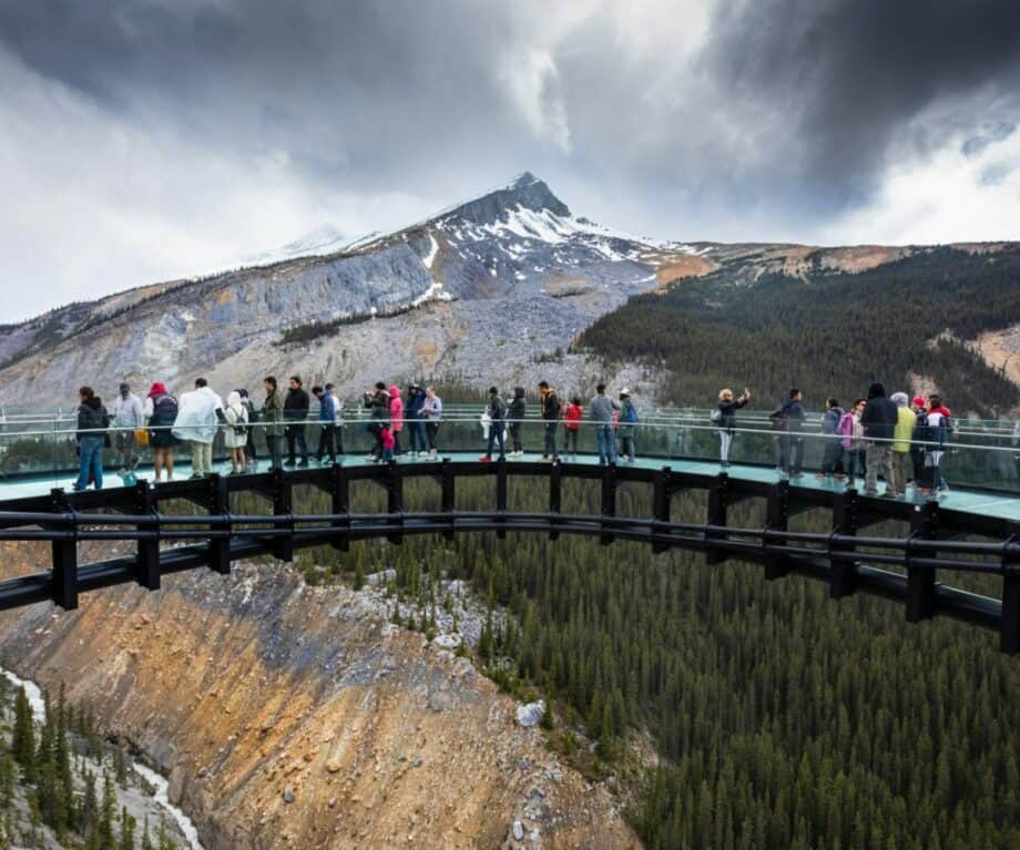 The drive between Banff and Jasper takes you north up the famous Icefields Parkway, a journey on which you can enjoy countless stunning stops along the way. The midway point is the Columbia Icefield, where you can see and walk on the incredible Athabasca Glacier. If you’re brave enough, you can then step out on the Icefield Skywalk, a suspended platform where glass is all that separates you from the rugged and wild terrain.