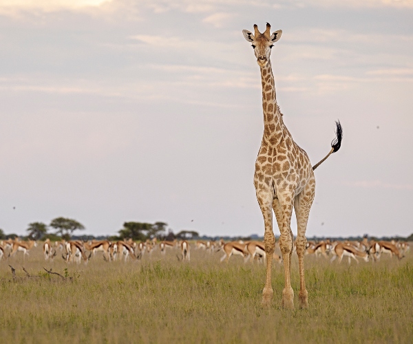 When the zebras reach Nxai Pan this is the perfect time and place for the females to give birth, and as we drove across the pan we could see it was dotted with countless long-legged, playful, zebra foals. Exploring the pan further, we discovered there was much more to see than just the zebras. Large groups of giraffes undulated gracefully towards acacia bushes, with males stopping occasionally to perform displays of necking, in that singular way male giraffes use to sort out their hierarchies. Herds of white-faced springbok, sometimes thousands strong, stretched out across the pan; young males playfully twisting and levering at each other with their horns, practising for later, when such skills would become important for establishing dominance and breeding rights. Shy bat-eared foxes, with their oversized ears, walked quietly, noses to the ground and ears cocked forward, listening for insects. A male and female ostrich protectively shepherded their flock of young, and several desert-adapted elephants ambled, remarkably quietly given their size, across the pan. The elephants here are sometimes called the ‘ghosts of Nxai Pan’ because of the way the white clay from the fossil pan sticks to their skin, giving them a whitish-grey hue. As we drove, we searched for, but never found, the famous black-manned Kalahari lions and cheetah, whose speed is so perfectly suited to the flat expensive landscape – the only trace of either was some tantalising tracks in the sand.