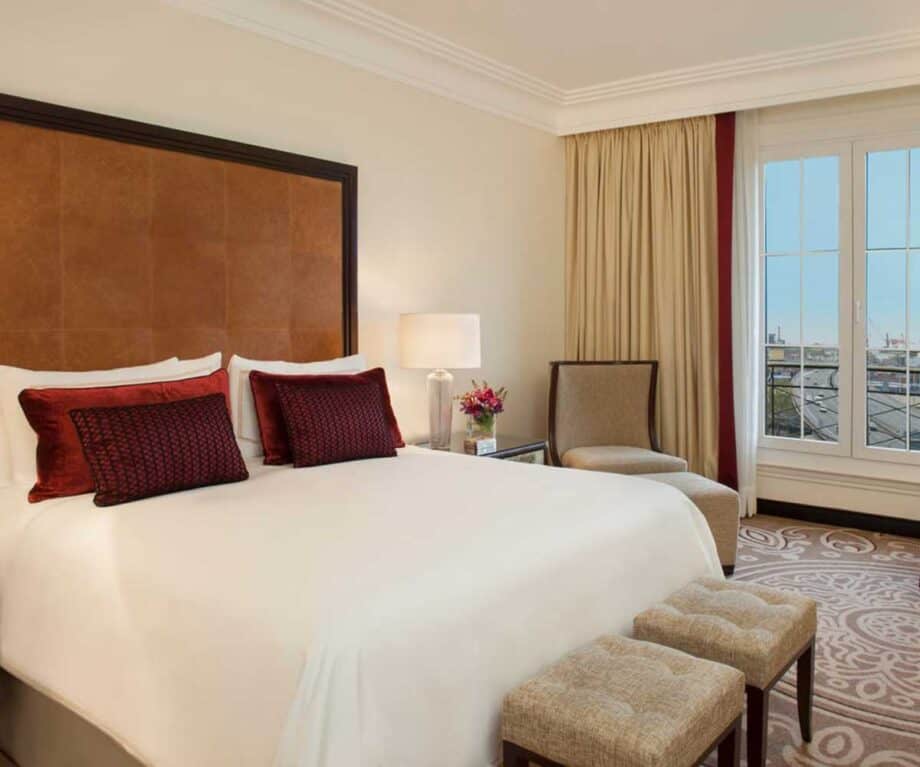 The rooms are decorated in calming creams and chocolate hues. The marble bathrooms are palatial enough to make you regret all your choices in your own house and the large windows offer views over the majestic city.