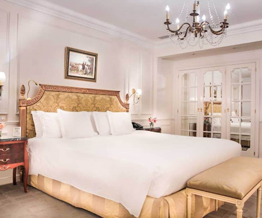 The rooms are dressed with gold-leaf print bedspreads and Louis XVI furniture. Toiletries are Hermes, nothing but the best in this exceptional hotel. The style is not all old-world luxury as the top two floors house fifteen new suites, all exuding modern elegance and with a dedicated lounge.