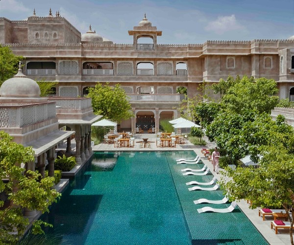 Commanding a wonderful setting in the middle of the desert, around an hour drive from blue city Jodhpur, the Mihir Garh offers a stunning retreat like few others in Rajasthan. It boasts of several unique design features and elements, such as hand-carved stone facades, intricate ‘jali’ work, and elaborate frescoes. The accommodations at Mihirgarh Rohet include luxury suites and villas, each with their own private plunge pools, terraces, and courtyards. The interiors are opulent and tastefully decorated, with a blend of contemporary and traditional aesthetics.
