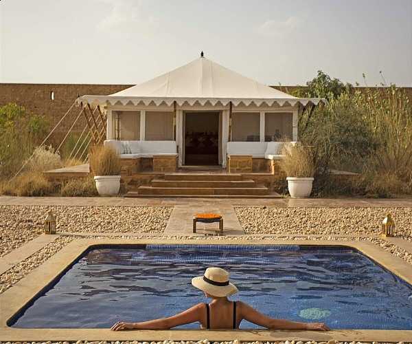 Sujan The Serai is a luxurious tented camp located in the heart of the Thar desert, approximately 40 minutes away from Jaisalmer city. The camp is spread over 100 acres of land and is designed to give an authentic desert experience without compromising on luxury. This Relais & Châteaux property offers 21 luxurious canvas tents, each boasting all the facilities one expects at a typical hotel rather than a tent; including a private veranda, living area, spacious air-conditioned bedroom and a stunning en-suite bathroom.