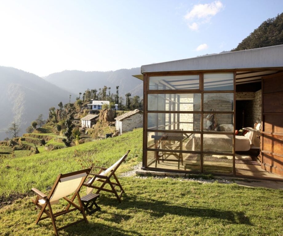 Shakti 360° Leti is located in the Bageshwar district north of where our Kumaon villages are. An innovative combination of traditional building techniques and contemporary design, 360° Leti is set in a stunning mountain wilderness at 8,000 feet. It is a place where you can take time to reflect, and allow the space, peace and beautiful landscape to work their magic around you. Located high up in the Himalayas the journey to reach Shakti 360 Leti is a spectacular adventure. It is a place where you can take time to reflect, and allow the space, peace and beautiful landscape to work their magic around you.