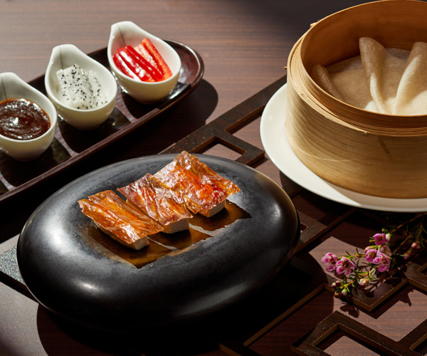 Our ‘Longevity’ set menu was an eight course journey through Cantonese fine dining, with plate after plate of beautifully presented plant based creations. Our amuse bouche was a rectangular platter of intrigue. Featuring a ‘century egg’ inspired tomato jelly, yam with charcoal and picked ginger, an heirloom tomato tart with tofu and a soy bean and Omnimeat dumpling served with a flavour packed vegan XO sauce. No Cantonese dining experience would be complete without a double-boiled soup and Peking duck and plant based versions of both were served at Mei Jiang. The Peking duck with gluten mock ‘duck’, topped with crispy potato ‘skin, and served with shredded leeks, cucumber, dragon fruit, pancakes and hoisin sauce was sublime. Absolute perfection on a plate. And our dessert of ‘Young Coconut Snow Swallow’ was possibly the most surprising dish on the menu. A miniature young coconut filled with hot coconut ‘snow ‘ and cubes of juicy aloe. Delicious.