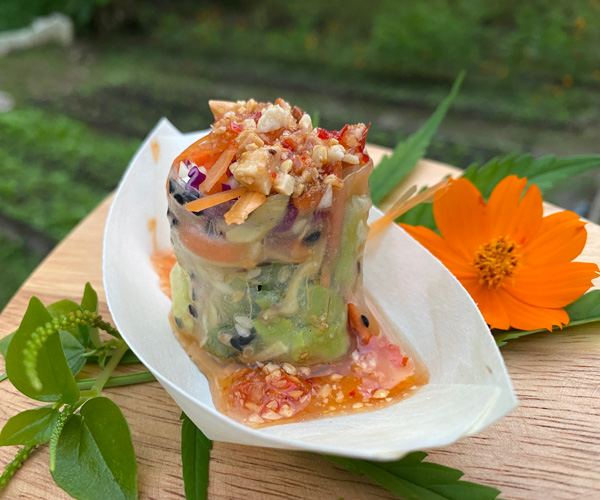 Colours of the Garden is located in the heart of the organic garden at Soneva Kiri and our meal was enjoyed in multiple locations throughout the verdant gardens. Chef and her team joined us as we foraged and collected herbs, salad and vegetables that would form part of our meal. Tasty morsels like fresh spring rolls with sweet chilli sauce were served whilst exploring, before settling down for a cocktail making masterclass where seasonal rose apples were muddled into a refreshing blend flavoured with garden herbs. At our next garden location, we enjoyed garlic and rosemary flatbreads with crudités and a duo of basil and sun dried tomato pestos. Other courses included ‘Het Sarong’, mushrooms and turnips wrapped in a woven bundle of crispy fried rice noodles and served with a sweet chilli sauce. We then gathered around the fire pit under the starlit sky and watched the next courses sizzle on the grill before they headed straight to our plates. Tofu satay, pulled mushrooms and eggplant scallops were all served straight from the grill; each was superb. The same can be said of our traditional pandan pudding dessert. Green pandan and black coconut charcoal were combined with swirls of fresh coconut for this not too sweet and deliciously melt in the mouth pudding made from rice flour and palm sugar.