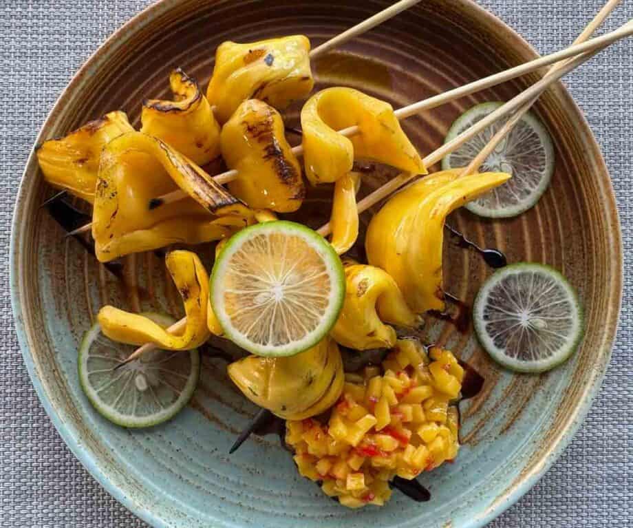 Our Edible Garden was a bountiful salad with baby sweetcorn, asparagus, sugar snap peas, baby carrots, pickled radish and potato puree. This was a fresh and vibrant, perfectly plant based start to our meal. We also enjoyed a Wild Mushroom Risotto and Eggplant Croquettes, both dishes packed with flavour and delicious. Our off menu dishes prepared by Chef Eddy and his team included more plant based delights such as an inspired dish of grilled jackfruit skewers and mango salsa which was quite possibly our favourite. The sweet jackfruit with smoky overtones from being grilled combined perfectly with the sweet and spicy mango chilli salsa. There was also a protein packed kidney bean curry, grilled vegetables served on a block of Himalayan sea salt and a vegan bowl with quinoa and a simple olive oil and lime dressing. All of our food at Sea. Fire. Salt was refreshing, healthy and light, which was just perfect for this refined beachfront dining destination.